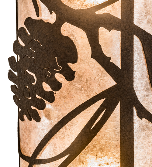 Listen closely. You can almost hear the soft whisper of the pine branches as they dance in the wind. Enjoy the warm ambiance of soft beautiful light diffused through the Silver Mica shade which features stunning Pinecone and Pine Branch designs. The frame and hardware are hand finished in a handsome Distressed Chestnut hue. This right side fixture can be paired with a left wall fixture model #200851. Handcrafted by highly skilled artisans in our 180,000 square manufacturing facility in Yorkville, New York. Diffuser colors, metal finishes and sizes can be customized. UL and cUL listed for dry and damp locations.