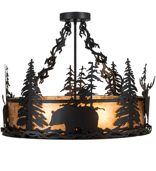 The call of the wild comes to light with a Deer and Bear roaming among Tall Pine Trees as the late afternoon sun sets in the background. Beautiful ambient light shines through Amber Mica while the curvaceous shade is enhanced with decorative accents, ballpoint finial, and hardware featured in a Textured Black finish. The ceiling fixture is custom crafted by expert artisans in our 180,000 square foot manufacturing facility, at the foothills of New York's glorious Adirondack Mountains. Dimmable energy efficient lamping options are available, as well as custom styles, colors, and sizes. The 24-inch wide fixture is UL and cUL listed for dry and damp locations.