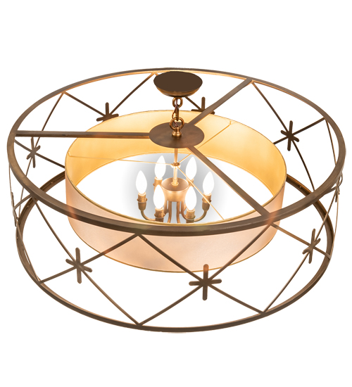 American craftsmanship creates the beauty of fine lighting with this elegant Penelope pendant. A circular frame embraces a stunning Golden TextraLite shade that is enhanced with cross designed accents hand finished in an Antique Copper hue. The result is a unique pendant-in-a-pendant style. Custom sizes, designs, and colors are available. Dimmable energy efficient lamping options are offered. UL and cUL listed for dry and damp locations, however, we do not recommend installing it in spaces that experience a large amount of moisture due to the fabric shade.