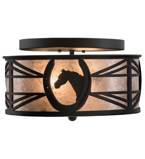 A horse portrait framed with a lucky horseshoe encircles this handsome ceiling fixture. Beautiful ambient light projects through stunning Silver Mica accented by a geometric design styled after fencing commonly found at horse stables. Decorative hardware, frame and accents are enhanced in a Textured Black finish. Perfect for game rooms, man caves and equestrian centers, as well as other residential and commercial spaces. Handcrafted by highly skilled artisans in the USA. Custom sizes, styles and colors are available. Energy efficient lamping options such as LED are offered. This fixture is UL and cUL listed for damp and dry locations.