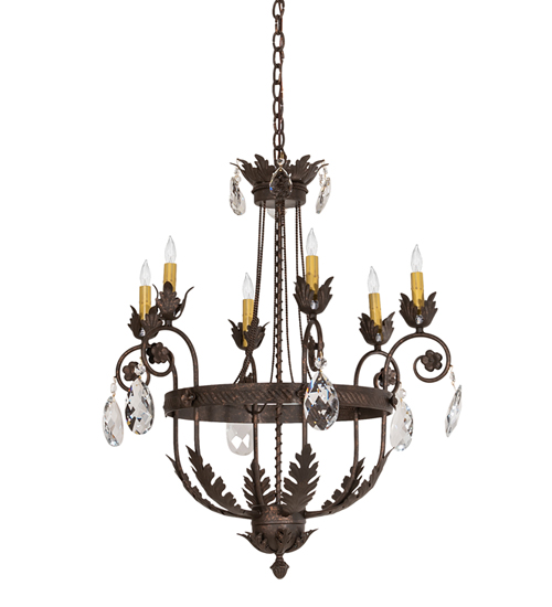 Exquisite styling and luxurious charm are reflected in this 6-light Antonia chandelier. This fixture combines faceted Crystal pendalogues, Hand-Forged Iron scroll arms, Acanthus leaves and rich Gilded Tobacco finished Hand-Forged Iron Hardware. The fixture features 6 Ivory faux candlelights to deliver ambient illumination. Handcrafted by highly skilled artisans in our 180,000 square foot manufacturing facility in Yorkville, New York. Custom sizes, styles, colors and dimmable energy efficient lamping options such as LED are available. The chandelier is UL and cUL listed for damp and dry locations.