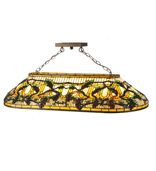 Bring sunny vineyards to your home or business with this lovely Meyda Original oblong pendant. Radiant Concord Purple jewels, Vineyard Green leaves and glistening dew-kissed Bark Brown vines wrap around the Golden Sunshine banded art glass shade created using the famous Meyda Tiffany copperfoil construction process and enhanced with a Mahogany Bronze finish. The overall height ranges from 15 to 47 inches as the chain length can be easily adjusted in the field. The Jeweled Grape Oblong Pendant is included in our American-designed, handcrafted Stained Glass Lighting Collection. UL and cUL listed for dry and damp locations. This is custom-made. Call for price and availability.