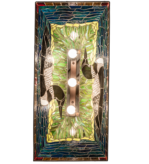 A Black and White Loon floats on sparkling Bluish Green waters beside Marsh Green grasses in stunning panels handcrafted utilizing stained art glass in a copperfoil construction. Ideal for placement over kitchen islands, counters and billiard tables. Mahogany Bronze finished canopy and chain included. Custom designs, colors and sizes available.