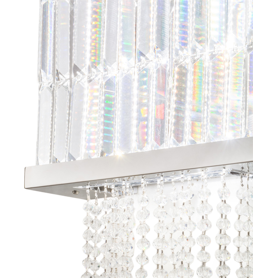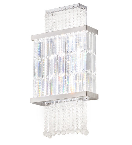 Luxurious jewelry inspired elements elevate this design aesthetic to a new level. Exquisite Crystal Baguettes provide a prismatic brilliance while illuminated by Integral LEDS for energy efficient ambient light. The Baguettes are complemented with rows of Crystal beads above and below. This ADA Compliant wall sconce is enhanced with a Chrome finish. The number of crystals, metal finishes and fixture size can be customized to your needs. UL and cUL listed for dry and damp locations.