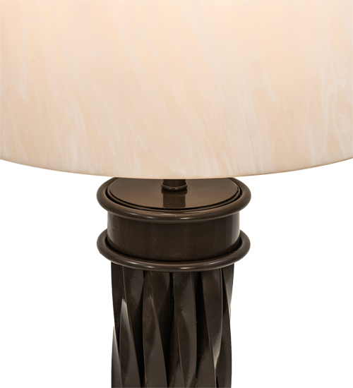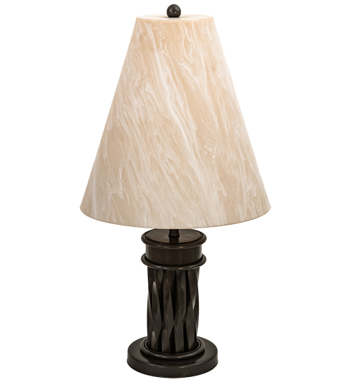 Sophisticated, handsome, and proportional. Designed to be surface mounted and hardwired to surfaces such as tables, bars, and counters, this table lamp is ideal for illuminating homes, taverns, offices, and public spaces. The sleek, cone-shaped shade features a stunning Fleshtone Idalight shade and is enhanced with a custom-fabricated base from a tightly twisted square bar, round bar trim, and laser-cut components- all hand-finished in Timeless Bronze. The Cone Mosset Table Lamp is included in our American-made, American-designed, handcrafted Modern Lighting Collection and manufactured in Yorkville, New York. The lamp is UL and cUL listed for dry locations. Our portable lamps seamlessly combine elegance and function, offering accent, ambient, task, and decorative lighting for any space. Perfect for cozy nooks, stylish bedside setups, or as focal points, these lamps bring warmth and sophistication to luxurious and contemporary interiors alike. The lamp is featured in Mahogany Prime Steakhouse in Tulsa, Oklahoma.