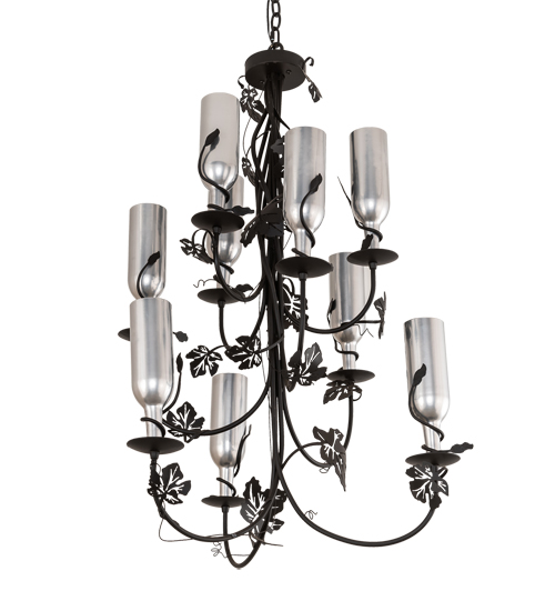 Capture the life of the party with the whimsical design of the Meyda Wine Bottle Chandelier. So much fun that you may want to hang from it, but don't! Liven up a restaurant, club, or home with a chandelier that does so much more than deliver light; it adds personality and pizzazz. Nine Chrome Blue inverted Wine Bottles are embraced by Textured Black finished bobeches with Vine and Leaf accents. Ideal for illuminating great rooms and entryways in homes, restaurants, hotels, pubs, nightclubs, wineries, and retailers, this pendant will be appreciated for its fine detail and charm by connoisseurs from Washingtonville, New York, to Bluemont, Virginia, to Napa Valley, California. The overall height ranges from 45 to 164 inches as the Black cords can be adjusted to meet your exact lighting requirements. This rich-looking?Tuscan Vineyard 9 Light Wine Bottle Chandelier?is included in our American-made, American-designed, handcrafted Wine Bottle Lighting UL and cUL listed for dry and damp locations.Take your finest bottle of wine, and Meyda will transform it into an everlasting personalized fixture of light. Contact us for more information on custom wine bottle lighting fixtures and lamps. You can also create custom lighting with beer bottles, mason jars, milk bottles, and other glass containers and vessels by contacting us!