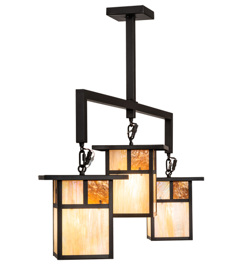 Handcrafted from Solid Brass. This Craftsman Signature Pendant is inspired by the Arts and Crafts movement. The striking Mission straight line design features three shades with a top diffuser in Amber Mica Shade and the lower diffuser in Beige Iridescent Glass. The three light pendant is enhanced with a Craftsman Brown finished frame and hardware. The fixture is perfect for illuminating timber homes, modern farmhouses and other residential, hospitality and commercial settings. Handcrafted by highly skilled artisans in our 180,000 square foot manufacturing facility in Upstate NY. Diffuser colors, metal finishes and fixture sizes can be customized to your needs. UL and cUL listed for dry and damp locations.