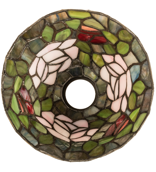 The most beloved of all floral beauties. The Rosebush is beautifully represented in this stunning reproduction of a Tiffany Studio Classic. Petal Pink, Romantic Red and Beautiful Blue art glass Roses ramble on a maze of Garden Green leaves. The luxurious shade is created using the famous Meyda Tiffany copperfoil construction. The delicate domed stained glass shade can be paired with a base to create a stunning table lamp or hardware to produce a beautiful ceiling fixture.