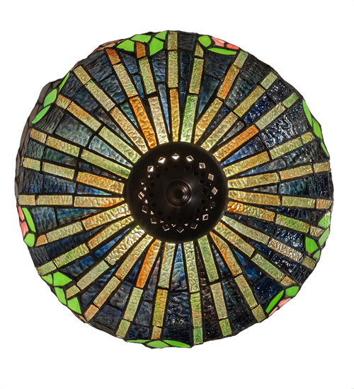 The Tiffany Honey Locust is inspired by Tiffany Studios' highly sought-after art glass design. The shade features petals of Green, Orange, Mauve and Burgundy blended with floral stems in Green, Amber, Blue and Burgundy Ripple Glass. The flowers are featured on a Blue and Purple Ripple Glass background. This exquisite inverted shade was crafted using hand-cut art glass and the famous Meyda Tiffany copperfoil construction process. This elegantly styled shade recaptures the artistry and craftsmanship perfected by Tiffany in his original creations and will add beautiful character to any room. The finish is Mahogany Bronze. The overall height can be adjusted by combining the four stem lengths included: 9-inch, 15-inch, 19-inch, and 27-inch in any combination to achieve the desired drop from the ceiling. The Tiffany Honey Locust Pendant is included in our American-made, American-designed, handcrafted Quality Bent Glass Collection, which is manufactured in Yorkville, New York. UL and cUL listed for dry and damp locations.