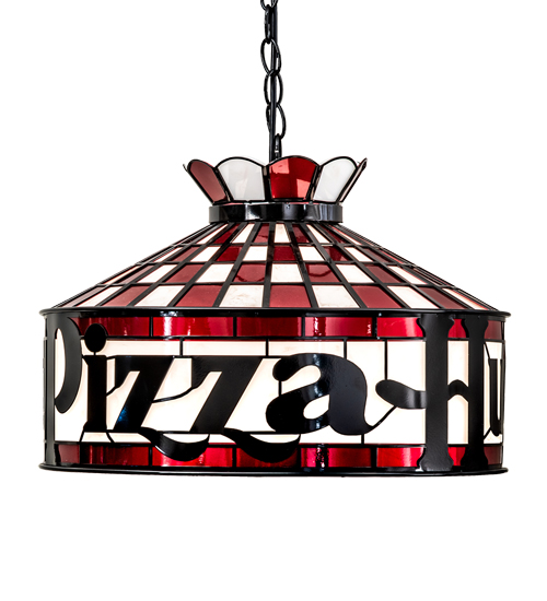 This ceiling pendant is personalized with the famous Pizza Hut brand name featured in a handsome Mirrored Black finish. Soft ambient light is diffused beautifully through the Statuario Idalight lens, which is complemented by Candy Red and White hues. The fixture is perfect for installation in a restaurants dining area. The overall height of this pendant ranges from 15 to 50 inches, as the chain length can be easily adjusted on location to accommodate your specific lighting application needs. The Personalized Pizza Hut Pendant is included in our American-made, American-designed, handcrafted Personalized Collection and manufactured in Yorkville, New York. The fixture is UL and cUL listed for dry and damp locations. This lighting fixture style can be ordered by calling us or adding your business logo or family name for your next project. Please call for pricing and lead time.