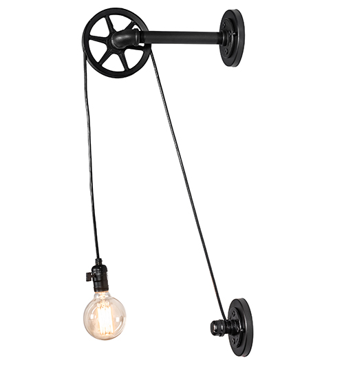 Eclectic minimalism and industrial design are defined with a dramatic single-wheel pulley system that enhances the aesthetics of this hanging wall sconce. This dramatic wall fixture suspends an Edison-styled lamp and offers an intriguing lighting design for homes, lounges, restaurants, and other residential and commercial spaces. The round metal canopy and hardware are featured in an Oxidized Steel finish. The Alva Bartlett Wall Sconce is included in our American-made, American-designed, handcrafted Alva Lighting Collection. Manufactured in Yorkville, New York. UL and cUL listed for dry and damp locations.