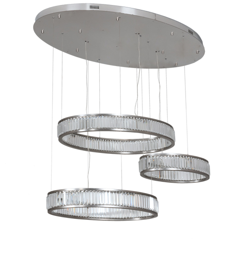 Luxurious jewelry-inspired elements elevate this design aesthetic to a new level as three rings of exquisite Clear Crystal Baguettes provide a prismatic brilliance while illuminated by Integral LEDs for dimmable, robust illumination, energy savings, minimal maintenance, and long life. The cascading chandelier is enhanced with a Brushed Stainless Steel finish. The rings can be adjusted in various configurations in the factory to accommodate your specific lighting application needs. The Beckam Cascading Chandelier is featured in our American-designed, handcrafted Luxury Lighting Collection. This fixture is Custom Made. Please call for cost and lead time.