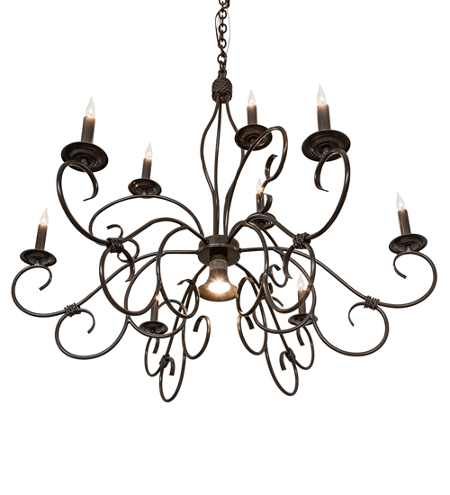 An elaborate, elegant chandelier design comes to light with sparkle and glamour. Beautiful ambient lighting emanates from 10 Complementary faux candlelights perched on fanciful bobeches. A matching, decorative customer-supplied downlight offers direct illumination from this lovely fixture. The chandelier is enhanced with Hand-Forged Iron Scrollwork in a Timeless Bronze finish. Custom crafted by highly skilled artisans in our 180,000 square foot manufacturing facility in Yorkville, New York. Shade styles, metal finishes and pendant sizes can be customized. UL and cUL listed for dry and damp locations.