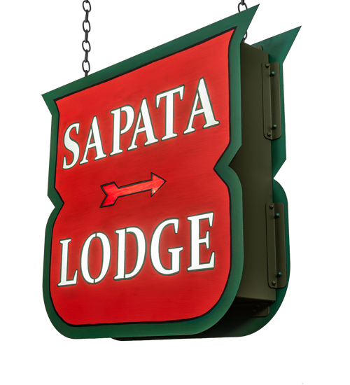 This stunning personalized sign features the SAPATA LODGE name that illuminates in Hand-Painted White on a Red Glass background, with a graphic featuring an arrow and a Green Metal Frame. The lodge name is illuminated with Integral LEDs for energy efficiency and long life. The attractive indoor/outdoor lighted sign can be suspended from various hangers and other structures. The Personalized Sapata Lodge Sign is included in our American-made, American-designed, handcrafted Personalized Collection and manufactured in Yorkville, New York. The fixture is UL and cUL listed for dry, damp, and wet locations and featured in the quaint Adirondack vacation setting of Big Moose, New York. This lighting sign can be ordered by calling us and adding your Camp Name or Company Branding for your next project. Please contact our designers to bring your custom signage to life.