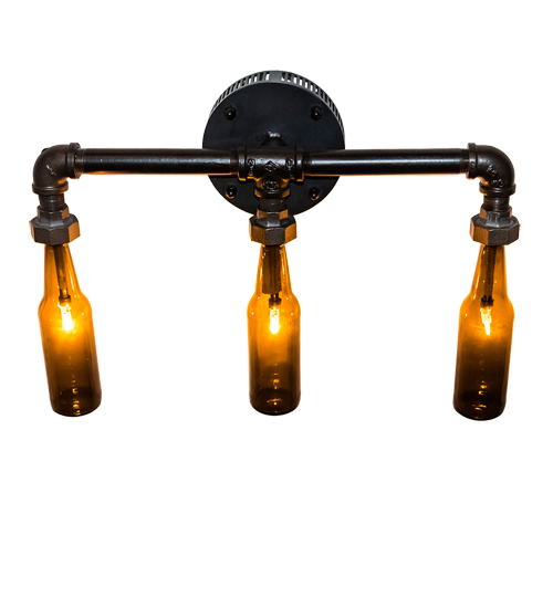 An impressive industrial look comes to light. Inspired by pipes used in today's structures, this frame is finished in Raw Steel. The PipeDream Wall Sconce features three Amber Glass Beer Bottles as diffusers that illuminate with LEDs. This sconce can be used as a wall fixture in a variety of rooms or as a vanity light in a fine bath. Made to Order by highly skilled artisans in our 180,000 square foot manufacturing facility in Yorkville, New York. Bottle styles, metal finishes and fixture sizes can be customized to your needs. UL and cUL listed for dry and damp locations.