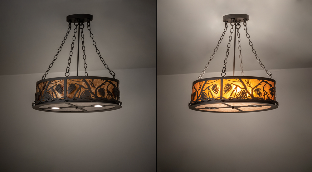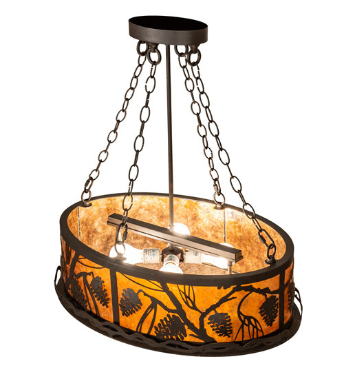 A Winter Pinecone with Pine Needles are featured on this inverted pendant. Rustic charm comes alive with soft ambient light projected through a stunning Amber Mica shade with a Silver Mica bottom diffuser. The Nature Inspired wall fixture is complemented with an Oil Rubbed Bronze finished hardware. Two downlights deliver functional illumination on surfaces below. The Winter Pine Pendant is featured in our American made, American designed handcrafted Nature Inspired Lighting Collection. Manufactured in Yorkville, New York. UL and cUL listed for dry and damp locations.