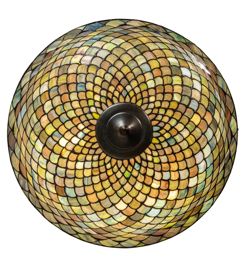An elegant reproduction of a Louis Comfort Tiffany Studio classic. The famous Fishscale design features a variegated Tortoiseshell of Emerald, Sapphire, Mauve and Beige colored art glass, evoking a unique dimensional and textured look in a rainbow of brilliant hues. This exquisite inverted art glass shade is created using the famous Meyda Tiffany copperfoil construction process. The pendant is complemented with a Mahogany Bronze finish. UL and cUL listed for dry and damp locations. Each shade is a unique work of art with color variations based on natural ingredients inherent in the glass. Contact us if color matching is critical when ordering multiple items.