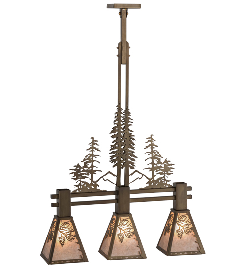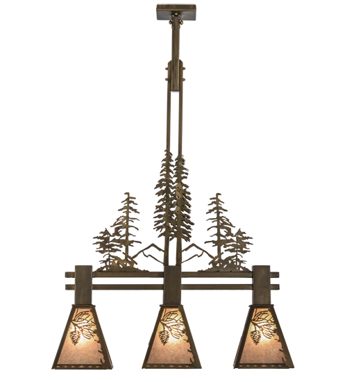 Naturally inspired pinecones and pine needles accent stunning Silver Mica with a frame and hardware highlighted with tall pine trees and a mountain range hand finished in Antique Copper. The hardware includes a swing canopy that adapts to vaulted ceilings. This pendant is ideal for illuminating an island, counter or dining table. Handcrafted by Meyda artisans at the foothills of the Adirondack Mountains in the USA, this fixture is available in custom sizes, styles, colors or dimmable energy-efficient lamping options.