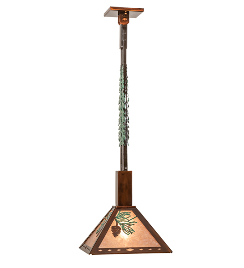 Delicate Vintage Copper Pinecones and Green Hand-Painted Pine Needles adorn a Silver Mica Shade on this stunning pendant. Green Hand-painted Pine Tree Silhouettes accent the suspension rods and fitter which are finished in Oil Rubbed Bronze. The canopy and shade frame are finished in Vintage Copper. Ideal for illuminating dining tables, kitchen islands, counters and bars to make a dramatic design statement. This nature inspired luminaire is created by highly skilled artisans in our 180,000 square foot manufacturing facility in Upstate New York, at the foothills of the Adirondack Mountains. Custom sizes, shade designs and metal finishes are available. UL and cUL listed for damp and dry locations.