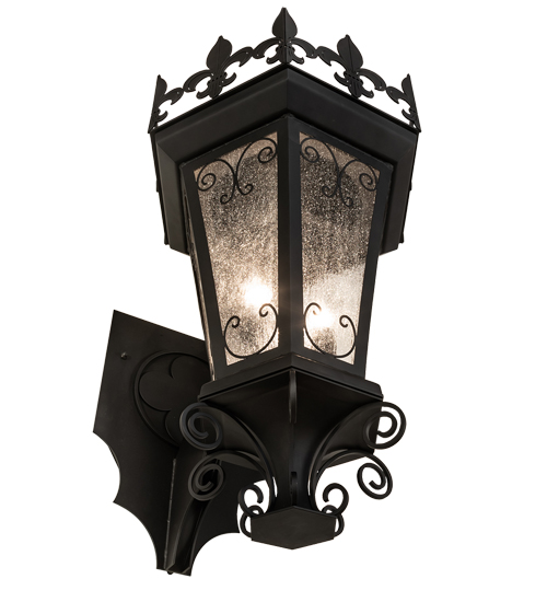 Stately, charm and sophistication come to light in a distinctive style. Enjoy the time-honored look of the Chaumont Wall Sconce, an authentic outdoor lantern design with classic styling and handcrafted construction. This shapely lantern features a Clear Seeded Glass lens, which reveals three complementary faux candlelights. The fixture is enhanced with Fleur-de-lis and scroll accents in an Anodized Effect Black finish. The striking wall fixture is perfect for exterior walls and facades in fine retail and hospitality locations. The Chaumont Wall Sconce is included in our American-made, American-designed, handcrafted Gothic Lighting Collection, manufactured in Yorkville, New York. It is UL and cUL listed for dry, damp, and wet locations.