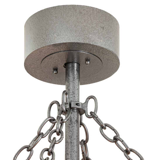 This innovative Chandel-Air combines a custom luminaire with energy-efficient fan technology. The Amber Mica diffuser is highlighted with Natural Iron finished accents featuring the RBQ logo and Ray Brothers Barbeque name. Hardware is featured in Black Textured finish. 8 inner lights bring out the beauty of the Mica, 8 uplights provide ambient illumination and 4 downlights deliver task illumination on surfaces below. Handcrafted in Yorkville, New York, this energy saving Chandel-Air pulls hot air up and keeps the space cool in the summer, and reversed in the winter to push down hot air and maintain warmth. Shown as example of our craftsmanship only and not for sale as is but can be customized to fit your personal needs.