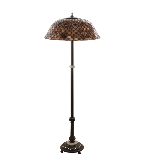 A Louis Comfort Tiffany studio classic. This Fishscale pattern is reproduced in variegated art glass of Honey dripped Amethyst and Citrine hues. The stunning shade is created using the famous Meyda Tiffany copperfoil construction and enhanced with a Mahogany Bronze finished floor base. A versatile lamp to complement any color or style. UL and cUL listed for dry locations. Each shade is a unique work of art with color variations based on natural ingredients inherent in the glass. Contact us if color matching is critical when ordering multiple items.