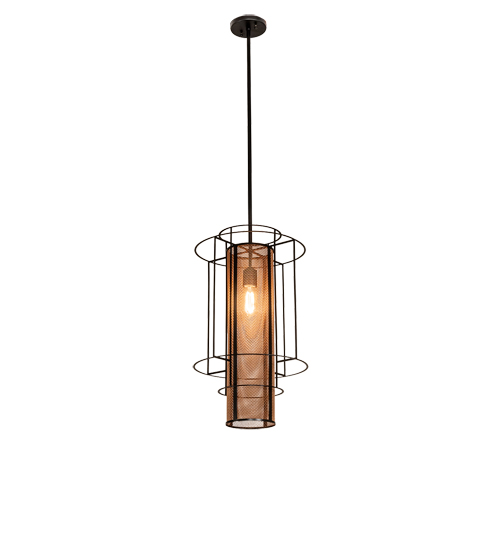 Discover a unique decorative look and industrial lighting design, revealing an exposed Edison-styled lamp displayed from within. The custom-crafted ceiling pendant features a Flat Black curvaceous frame with several rings and a Metallic Bronze Weave-Tex caged cylinder. Overall height ranges from 25 to 54 inches, as the stem can be cut in the field to meet your preferences. The Cilindro Golpe Pendant is included in our American-made, American-designed handcrafted Industrial Lighting Collection. Manufactured in Yorkville, NY. UL & cUL listed for dry and damp locations