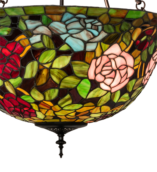 The most beloved of all floral beauties. The Rosebush is beautifully represented in this stunning reproduction of a Tiffany Studio Classic. Petal Pink, Romantic Red, Beautiful Blue and Plum Passion art glass Roses ramble on a maze of Garden Green leaves. The shade is created using the famous Meyda Tiffany copperfoil construction. The delicate domed stained glass shade is paired with a Mahogany Bronze finish. The overall height ranges from 32 to 67 inches as the chain length can be easily adjusted in the field to accommodate your specific lighting application needs. UL and cUL listed for dry and damp locations.