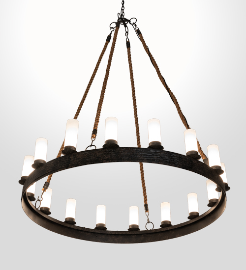 Gothic beauty meets rustic charm. The Costello Ring Chandelier features a rugged band embellished with a Barkerized texture and a handsome Coffee Bean finish. 16 Statuario Idalight Cylindres are perched on bobeches and provide beautiful ambient lighting for residential, commercial, and hospitality settings. Four industrial-styled ropes support the solid ring featured in this exquisite pendant. Ideal for installation entryways and other spaces in fine homes and hotels from West Hills, New York, to Minneapolis, Minnesota, to Monterey, California. The Costello Ring Chandelier is included in our American-made, American-designed, handmade Transitional Lighting Collection and manufactured in Yorkville, NY. UL and cUL listed for dry and damp locations.