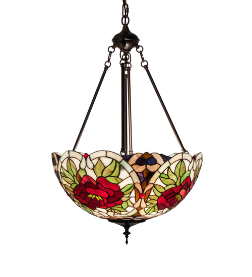 Add beauty and elegance to your home or business with this Tiffany styled art glass pendant. The inverted shade features a Red Rose, framed in Woodland Green leaves and Ivory scrolls that sit on a Lavender and Plum Bronze lace art glass background. This beautiful shade is created using the famous Meyda Tiffany copperfoil construction process. The stunning shade is enhanced with a Mahogany Bronze finish. Overall height ranges from 32 to 67 inches as the chain length can be easily adjusted in the field. UL and cUL listed for dry and damp locations. Each shade is a unique work of art with color variations based on natural ingredients inherent in the glass. Contact us if color matching is critical when ordering multiple items.