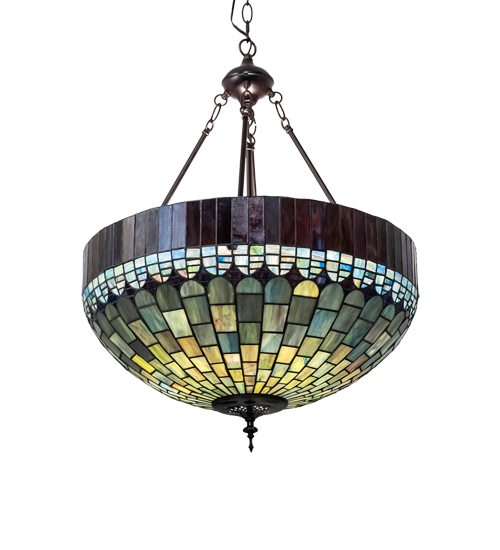 Tiffany Studios used artful mastery to develop the look of woven fabric with a fringed skirt made of glass. We have taken that concept one step further with a Multi-hued Amber Plum fringe that suspends an inverted dome brickwork intertwined with Emerald, Cobalt, Heather, Byzantium, Navy and Amber art glass. The shade is created using the famous Meyda Tiffany copperfoil construction and enhanced with a Mahogany Bronze finish. Overall height ranges from 32 to 67 inches as chain length can be easily adjusted in the field. UL and cUL listed for dry and damp locations. Each shade is a unique work of art with color variations based on natural ingredients inherent in the glass. Contact us if color matching is critical when ordering multiple items.