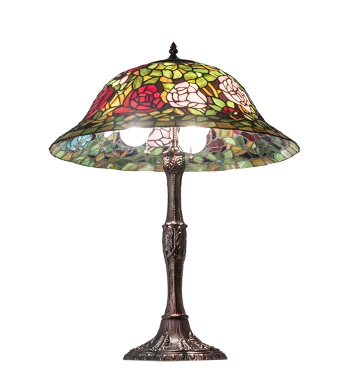 The most beloved of all floral beauties. The Rosebush is beautifully represented in this stunning reproduction of a Tiffany Studio Classic. Petal Pink, Romantic Red and Beautiful Blue art glass Roses ramble on a maze of Garden Green leaves. The shade is created using the famous Meyda Tiffany copperfoil construction. The delicate domed stained glass shade is paired with a Mahogany Bronze finished lamp base. UL and cUL listed for dry locations.
