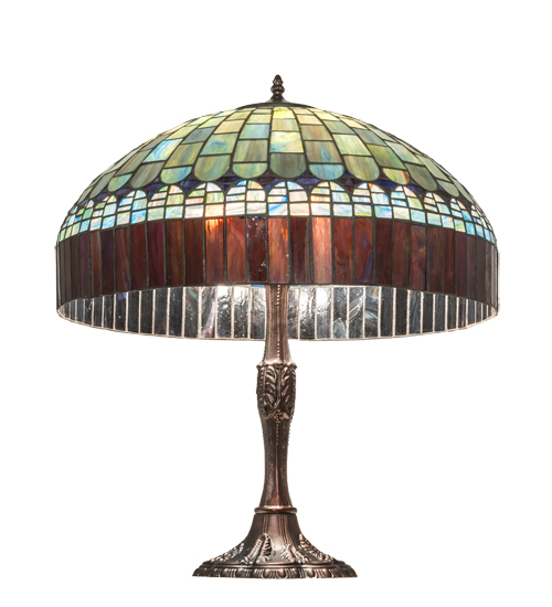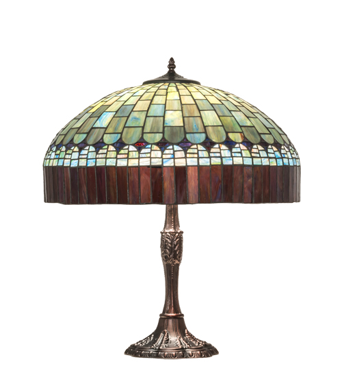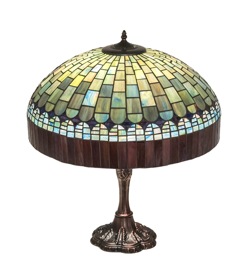 In the early 20th century, Tiffany Studios used artful mastery to develop the look of woven fabric with a fringed skirt out of glass. Meyda Tiffany is able to configure this timeless reproduction into a stunning table lamp. The shade features Multi-hued Plum fringe with dome brickwork intertwined with Emerald, Cobalt, Heather, Xanadu, Azure and Saffron art glass. The art glass shade is created using the famous Meyda Tiffany copperfoil construction process and is enhanced with a table base finished in Mahogany Bronze. UL and cUL listed for dry locations. Each shade is a unique work of art with color variations based on natural ingredients inherent in the glass. Contact us if color matching is critical when ordering multiple items.