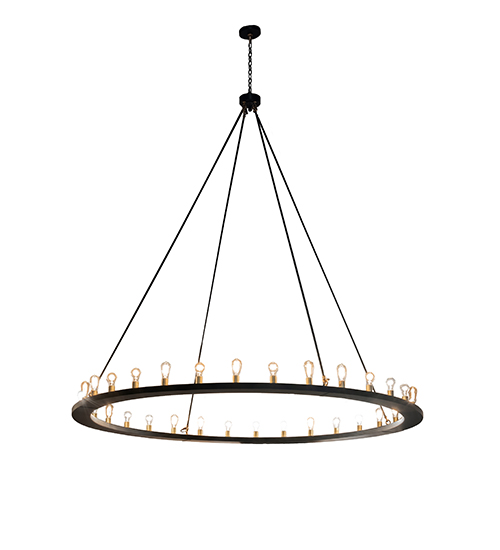 Blending an elegant style with a classic, distinguished look... This massive Loxley Chandelier is custom-crafted with 32 clear glass bulbs with Brushed Brass bases on a sturdy ring featured in a Solar Black finish. Overall height ranges from 101 to 220 inches as the chain easily adjusts in the field. The fixture is ideal for illuminating dining tables, lobbies, entryways, and other residential, hospitality, and commercial spaces. The Loxley Chandelier is featured in our American-made, American-designed, handcrafted Transitional Lighting Collection. Manufactured in Yorkville, New York. UL and cUL listed for dry and damp locations.