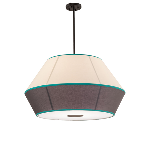 Inspired by daring satellites that orbit in space and are engineered by astrophysicists, this multifaceted element features a modern design. The uniquely shaped shade offers a Cream colored Linen fabric lined with Aqua trim and enhanced with a Bronze cap on the bottom. Place this pendant to illuminate dining tables and other residential and commercial areas from Manhattan, New York, Washington D.C., and Los Angeles, California. See the larger matching pendant, model 234546. The Zoe Pendant is included in our American-designed, handcrafted Art Deco Lighting Collection. UL and cUL listed for dry and damp locations; however, we do not recommend placing it in spaces that experience a large amount of moisture due to the fabric shade. This pendant is Custom Made. Call for Lead Time and Pricing.