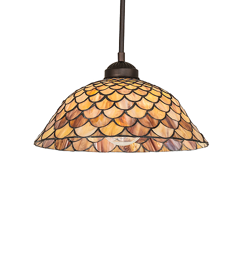 A Louis Comfort Tiffany studio classic. The famous Fishscale design features Honey dripped Beige, Amber, Purple, and Mauve colored art glass. The shade design evokes a unique dimensional and textured look in a rainbow of brilliant hues. This exquisite art glass shade is crafted using the renowned Meyda Tiffany copperfoil construction technique and complemented by a Mahogany Bronze finish. The overall height can be adjusted by combining the four stem lengths that are included: 6-inch, 12-inch, 16-inch, and 24-inch, in any combination to achieve the desired drop from the ceiling. The Tiffany Fishscale Pendant is featured in our American-designed, handcrafted Tiffany Reproduction Collection. UL and cUL listed for dry and damp locations. Each shade is a unique work of art, featuring color variations derived from the natural ingredients inherent in the glass.