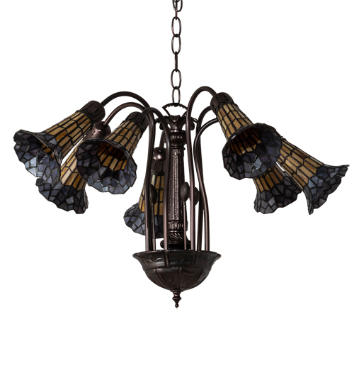 One of the most popular Louis Comfort Tiffany style chandeliers. This fixture re-creates his famous design from the early 1900s. The Pond Lily offers an attractive, delicate design featuring 7 art glass shades created with the famous Meyda Tiffany copperfoil construction. Lily shades featuring Honey Wispy and Purple art glass are suspended from stems delicately winding above a Lily pad hub finished in Mahogany Bronze. Overall height ranges from 19 to 57 inches as the chain length can be easily adjusted in the field. UL and cUL listed for damp and dry locations. Each shade is a unique work of art with color variations based on natural ingredients inherent in the glass. Contact us if color matching is critical when ordering multiple items.