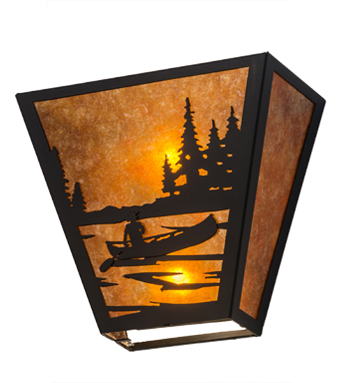 This nature inspired design depicts a sportsman paddling his canoe down a gentle mountain stream as the sun rises in the background. Handcrafted with Amber Mica and hardware hand finished in Black. Made in the USA by Meyda artisans at the foothills of Upstate New York's Adirondack Mountains. Indoor/Outdoor lighting applications. Custom colors, designs and sizes available. Energy efficient lighting options.
