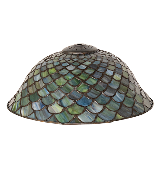 A Louis Comfort Tiffany studio classic... The renowned Fishscale design features a variegated Tortoiseshell of Emerald, Sapphire, Mauve, and Beige colored art glass, evoking a unique dimensional and textured look in a rainbow of brilliant hues. This exquisite art glass shade is created using the famous Meyda Tiffany copperfoil construction process. Rainbow Trout and other colorful fish inspired the lamp design. The shade pairs well with a base to create a stunning table lamp or is matched with hardware to build a beautiful ceiling fixture. The Tiffany Fishscale Table Lamp is included in our American-designed, handcrafted Tiffany Reproduction Lighting Collection. UL and cUL listed for dry locations. Each shade is a unique work of art with color variations based on natural ingredients inherent in the glass.