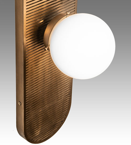 A dramatic and decorative illuminating accent for homes, restaurants, retail spaces, and other commercial environments. The Sanderson wall sconce offers a minimalist design featuring two round White Opal Glass diffusers on a stunning Antique Copper, louver-designed, textured frame. This contemporary piece combines form and function, featuring a minimalist approach with restoration-style form. This wall fixture can be flanked on both sides of a mirror as a vanity light or placed in a hallway or entryway as a wall sconce. The Sanderson Wall Sconce is included in our American-made, American-designed, handcrafted Industrial Lighting Collection, manufactured in Yorkville, New York. It is UL and cUL listed for dry and damp locations.