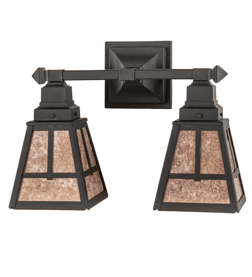 The "T" Mission Lighting fixture is perfect for fine interior lighting applications and features Craftsman Signature-style lanterns. The fixture features two Silver Mica shades with a frame and hardware in Costello Black Hand-Rubbed Iron. Perfect for illuminating fine baths and hallways in homes and hospitality locations from Biltmore, North Carolina, to Dumbarton Oaks in Washington, DC, to Montecito, California. The "T" Mission Vanity Light is included in our American-made, American-designed, handcrafted Mission Lighting Collection and manufactured in Yorkville, New York. UL and cUL listed for dry and damp locations.