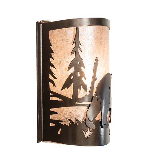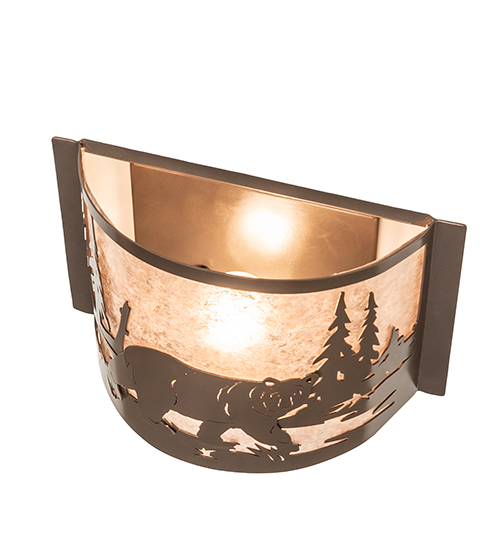 A mighty Bear wanders by a lake in the woods on this nature-inspired wall sconce. The stunning fixture feature the Bear and Tall Pine Tree accents in a Brown Bronze finish on a curvaceous Silver Mica shade. This ADA Compliant wall sconce is ideal for illuminating walls in hotel and restaurant corridors and other hospitality, commercial, and restaurant spaces. The Bear at Lake Wall Sconce is included in our American-made, American-designed, handcrafted Wildlife Collection. Manufactured in Yorkville, New York. UL and cUL listed for dry and damp locations.