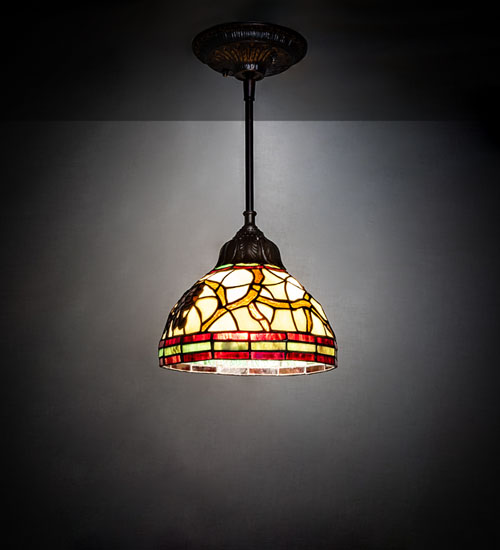 Inspired by the White Mountain Forest of New England to the Sawtooth National Forest in Utah and Idaho, to the White Mountains of eastern California. This stunning Meyda Original art glass design features the iconic Pinecone, one of Mother Nature's most compelling organic symbols, which offers natural elegance and represents the evolution of human enlightenment. Burgundy and Leaf Green bands edge this woodland shade, highlighting Light Brown pinecones and Golden Sun branches on a Beige art glass shade. The beautiful shade is created using the famous Meyda Tiffany copperfoil construction technique. Overall height ranges from 15 to 67 inches as the suspension rod can be adjusted and assembled in the field using four tube lengths that are included. Place the mini pendant in groups to create a dramatic design statement over kitchen islands, dining tables, bars, and counters. The overall height can be adjusted by combining the four stem lengths included: 9-inch, 15-inch, 19-inch, and 27-inch in any combination to achieve the desired drop from the ceiling. The Pinecone Mini Pendant is included in our American-designed, handcrafted Nature Inspired Stained Glass Collection. UL and CUL listed for dry and damp locations.
