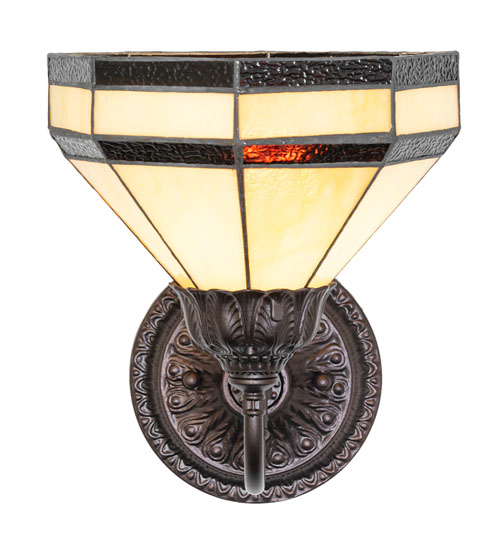 The Topridge lighting design is inspired by Marjorie Merriweather Post's retreat in Paul Smiths, New York, outside Lake Placid, where the 1932 and 1980 Winter Olympics were held. The original ceiling fixture was installed in the Main Lodge in the vacation camp built in 1923. Bark Brown Granite Glass borders the exquisite Beige Stained Glass shade of this wall sconce. The classic styling of this Tiffany-inspired wall fixture and soft pastel colors will add charm to any room. The inverted shade is handcrafted using the famous Meyda Tiffany copperfoil construction process. The Topridge Wall Sconce is featured in our American-designed, handcrafted Stained Glass Lighting Collection. UL and cUL listed for dry and damp locations. Each shade is a unique work of art with color variations based on natural ingredients inherent in the glass.