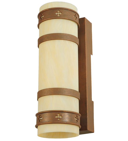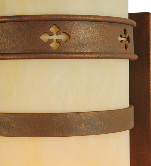 Stylized Byzantine Cross insignias adorn the sturdy border of this classic wall fixture. Ideal for interior and exterior applications, this luxurious shade is handcrafted of Sahara Taupe Idalight, graced and complemented with Antique Rust finished hardware. The cylindrical styled sconce is perfect for illuminating living spaces, foyers, conference rooms, lobbies and other spaces. Handmade by highly skilled artisans in the USA. Custom sizes, designs, finishes and dimmable lamping options such as LED are available. The fixture is UL and CUL listed dry, damp and wet locations.