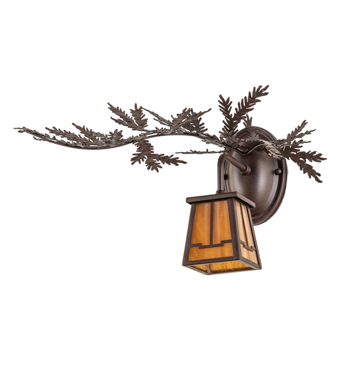Enjoy the natural beauty of the American woodlands with this stunning wall luminaire, which also can double as a vanity light fixture. Designed with Cafe Noir finished decorative metal branches and pine needles, the fixture illuminates with a Mission-styled lantern featuring a lovely Honey Art Glass lens. Inspired by Pine Forests located in the Bienville forest in central Mississippi, to the Ashley National Forest in Utah, to the Beaverhead-Deerlodge Forest in Montana. The fixture can be used as a vanity light in a fine bath or as a wall sconce in a hallway and other rooms in lodges, camps, and other residential and hospitality locations. This wall fixture matches well with the Pine Branch Valley View Right Wall Sconce, model 245635. The Pine Branch Valley View Left Wall Sconce is included in our American-made, American-designed, handcrafted Nature Inspired Collection and manufactured in Yorkville, New York. UL and cUL listed for dry and damp locations.