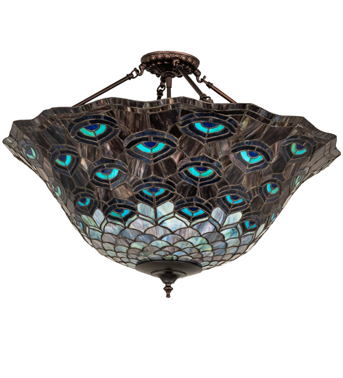 The Peacock Feather lighting design was inspired by one of Louis Comfort Tiffany's most beloved designs. Mauve with Beige, Pink, Orange, and Gray art glass adorn this shade, while the feathers feature colors of Turquoise, Blue, and Purple. A scalloped crest of Purple, Blue, Orange, and Green edges the shade created using the Meyda Tiffany copperfoil construction. The fixture is perfect for illuminating dining rooms, living spaces and entryways in residential and hospitality settings in Miami, Florida, Austin, Texas and Honolulu, Hawaii. The Tiffany Peacock Feather Inverted Pendant is featured in our American-designed, handcrafted Tiffany Reproduction Collection. UL and cUL listed for dry and damp locations. Each shade is a unique work of art with color variations based on natural ingredients inherent in the glass.