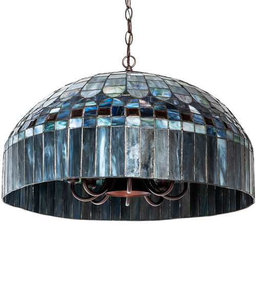 This exquisite art glass fixture features Multicolored Plum glass strips, including Yellows, Blues, and Purples, and domed brickwork of Greens, Plums, and Blue hues, crowning Blue Diamonds and multicolored tiles of Cobalt, Green, and Purple. The shade is created using the famous Meyda Tiffany copper foil construction and enhanced with a Mahogany Bronze finish. The overall height ranges from 23 to 58 inches as the chain easily adjusts in the field. The pendant is paired with a premium light cluster that includes a downlight to brighten a table and eight candelabras for even illumination of the stained glass. We would recommend that you pair this fixture with a wall dimmer for optimal performance in your space. The Tiffany Candice Pendant is featured in our American-designed Tiffany Reproduction Collection. UL & cUL listed for dry and damp locations. Each shade is a unique work of art with color variations based on natural ingredients inherent in the glass. Custom Made. Call for Pricing and Lead Time.