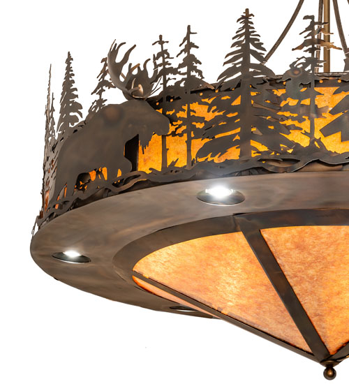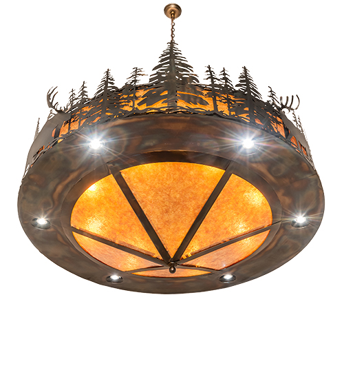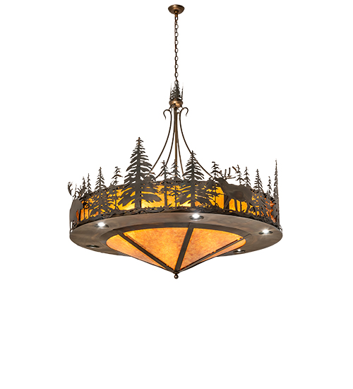 The call of the wild comes to light with Moose and Elk roaming through the Tall Pine woodlands as the afternoon sun sets in the background. Beautiful ambient light shines through an Amber Mica shade while the shade is enhanced with accents and hardware featured in a Dark Burnished Antique Copper finish. The lighting fixture illuminates with eight inner lights to bring out the beauty of the Mica and six downlights to deliver functional lighting on surfaces below. The downlights and inner lights benefit from separate circuits to give you precise dimming control over both layers of light to create the perfect ambiance in the space. The ideal centerpiece for illuminating hallways, entryways, and other residential, hospitality, and commercial spaces throughout the US, including Henderson, Nevada, to Helena, Montana, to Everett, Washington. The Wildlife at Dusk Inverted Pendant is featured in our American-made, American-designed, handcrafted Wildlife Lighting Collection. This fixture is manufactured in Yorkville, New York. UL and cUL listed for dry and damp locations.