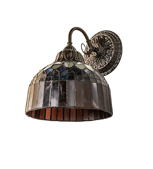Tiffany Studios used artful mastery to develop the look of woven fabric from art glass. Meyda Tiffany recreates this shade with Amber Plum glass fringe crowning a domed brickwork of Emerald, Cobalt and Ruby with Purple diamond shaped accents. The shade is created using the famous Meyda Tiffany copperfoil construction process and embraced with elegant cast metal hardware finished in Mahogany Bronze. The Tiffany Candice Sconce is included in our American designed, handcrafted Tiffany Reproduction Lighting Collection. UL & cUL listed for dry and damp locations. Each shade is a unique work of art with color variations based on natural ingredients inherent in the glass. Contact us if color matching is critical when ordering multiple items.